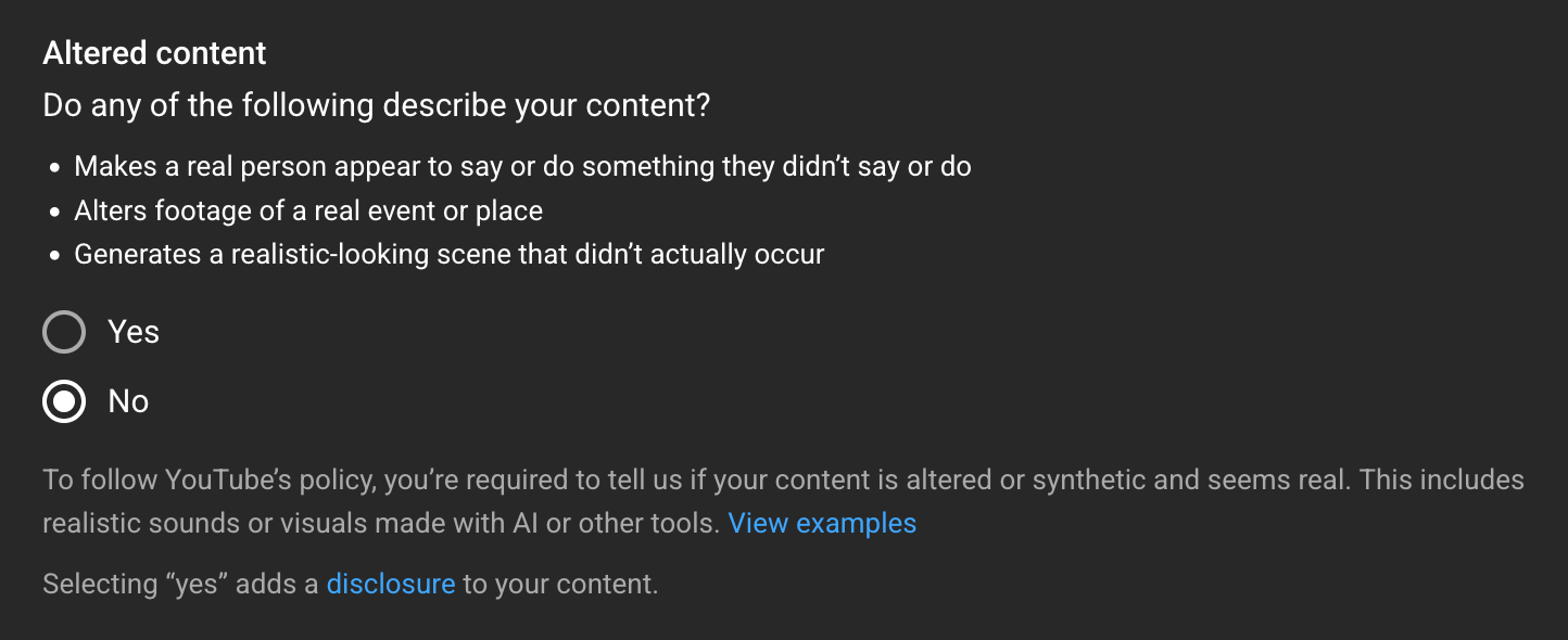 To follow YouTube's policy, you're required to tell us if your content is altered or synthetic and seems real. This includes realistic sounds or visuals made with AI or other tools. View examples