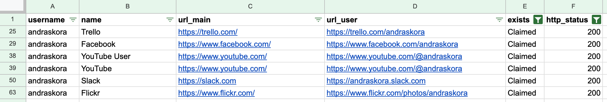 Searching |██████████████████████████████▏ | ▇▇▅ 1994/2647 [75%] in 1:03 (~20s, 31.9/s)The best of all - this is also true for Sherlock - you can save the search result in a CSV file, that you can later import into a spreadsheet to see all sorts of additional information, like the response code from the servers for each profile check.