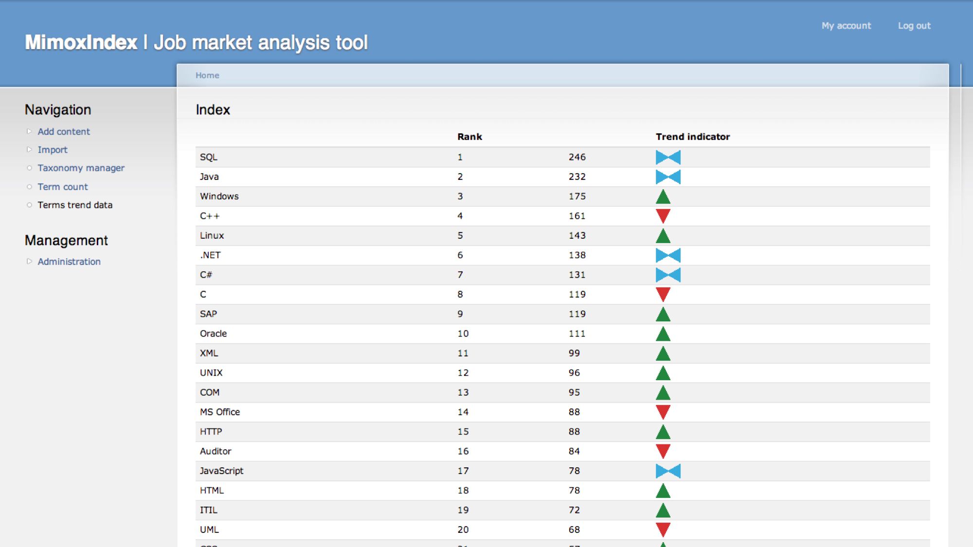 MimoxIndex was an online job market analysis tool for a recruitment agency. It involved many components:
